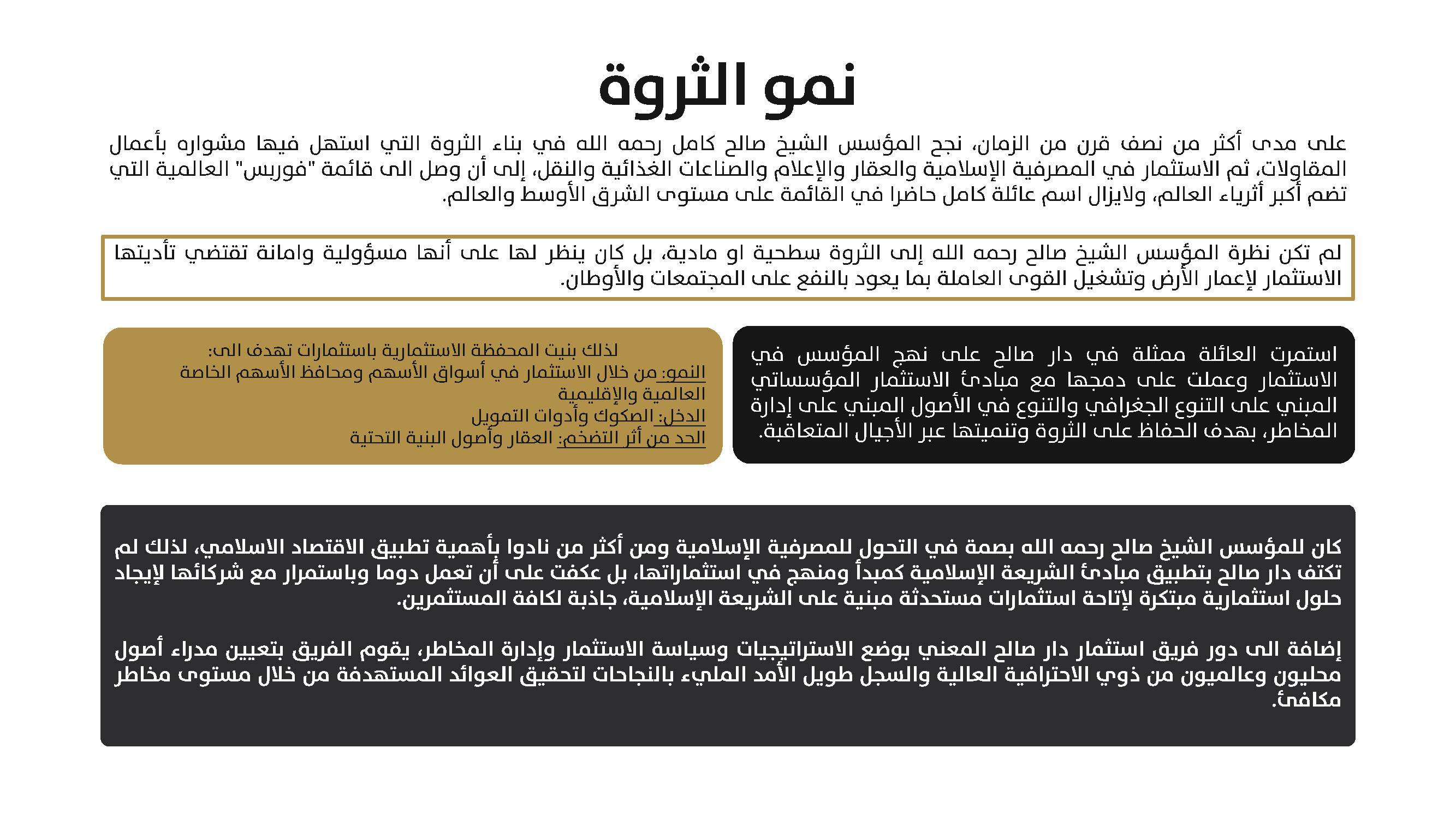 هي دار تجسد رؤية الشيخ صالح عبدالله كامل "رحمه الله" بأن تكون مستثمر مؤسساتي تكرس جهودها للمساهمة في إعداد الأجيال القادمة بتطوير القيادات والكفاءات، وتساهم في استمرارية انجازات المؤسس وأعماله كمنبع للأفكار الاستثمارية ومنارة لاستمرارية الأعمال.